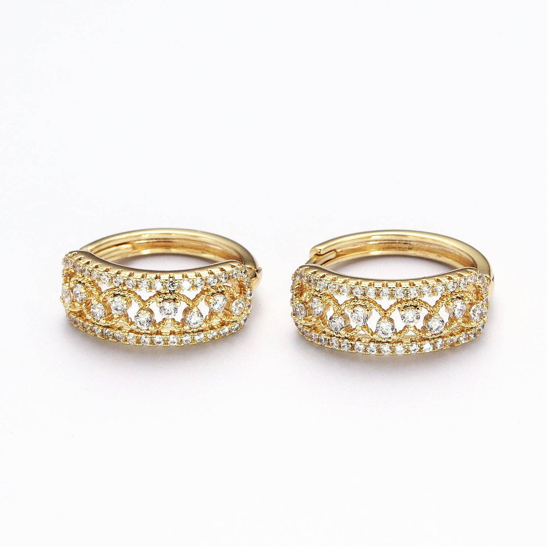 Gold Elaborate Micro Paved Cubic Zirconia Wide Huggie Hoop Earrings