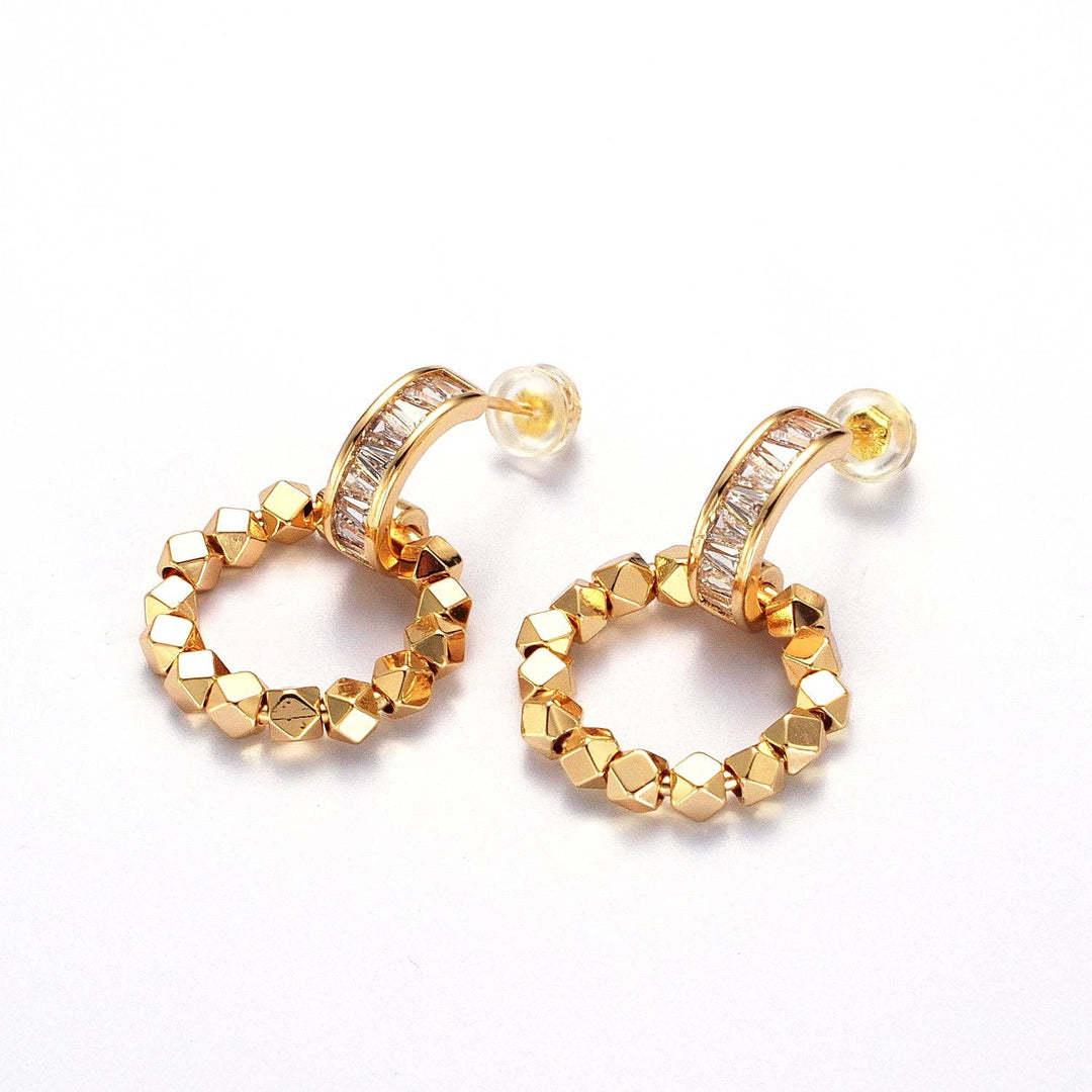 Baguette C Shaped Round Gold Cube Bead Dangle Drop Earrings