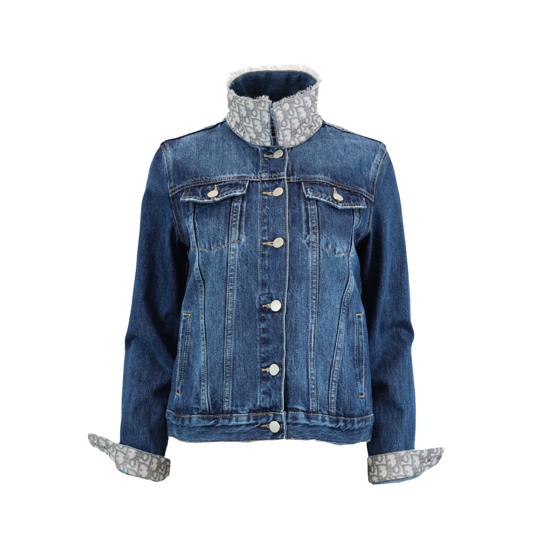 This one-of-a-kind designer denim jacket is adorned with an authentic Dior monogram on saddle scarf. Each jacket has the scarf on the back, the collar and sleeve cuffs. Jacket comes with receipt of authenticity for scarf in front jacket pocket.