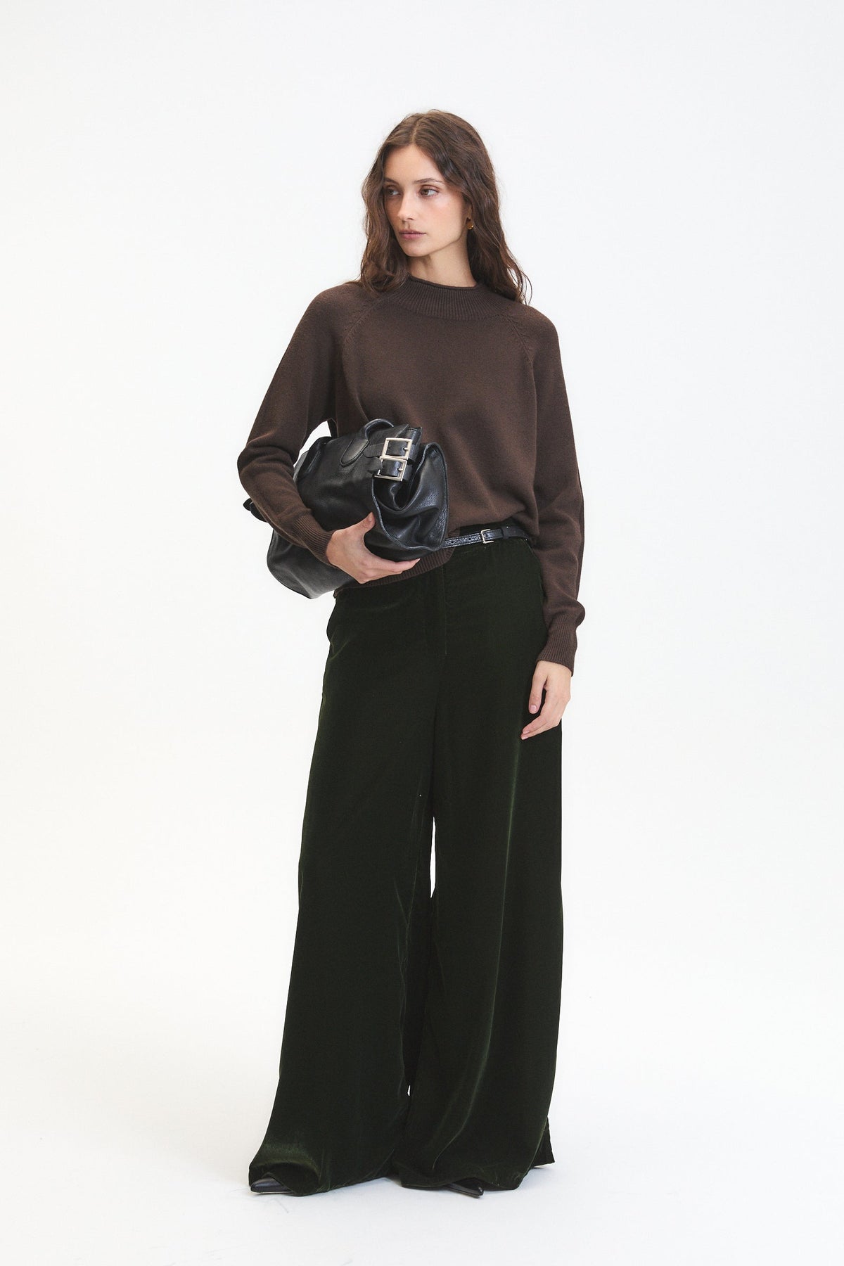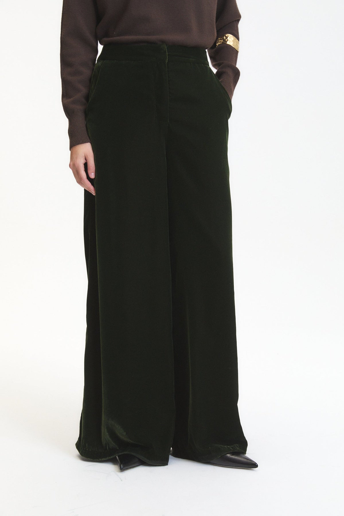 Velvet wide leg pants. Side pockets. Fake welt pocket and darts for shaping on the back. Hooks and zipper for closure on front. High rise.