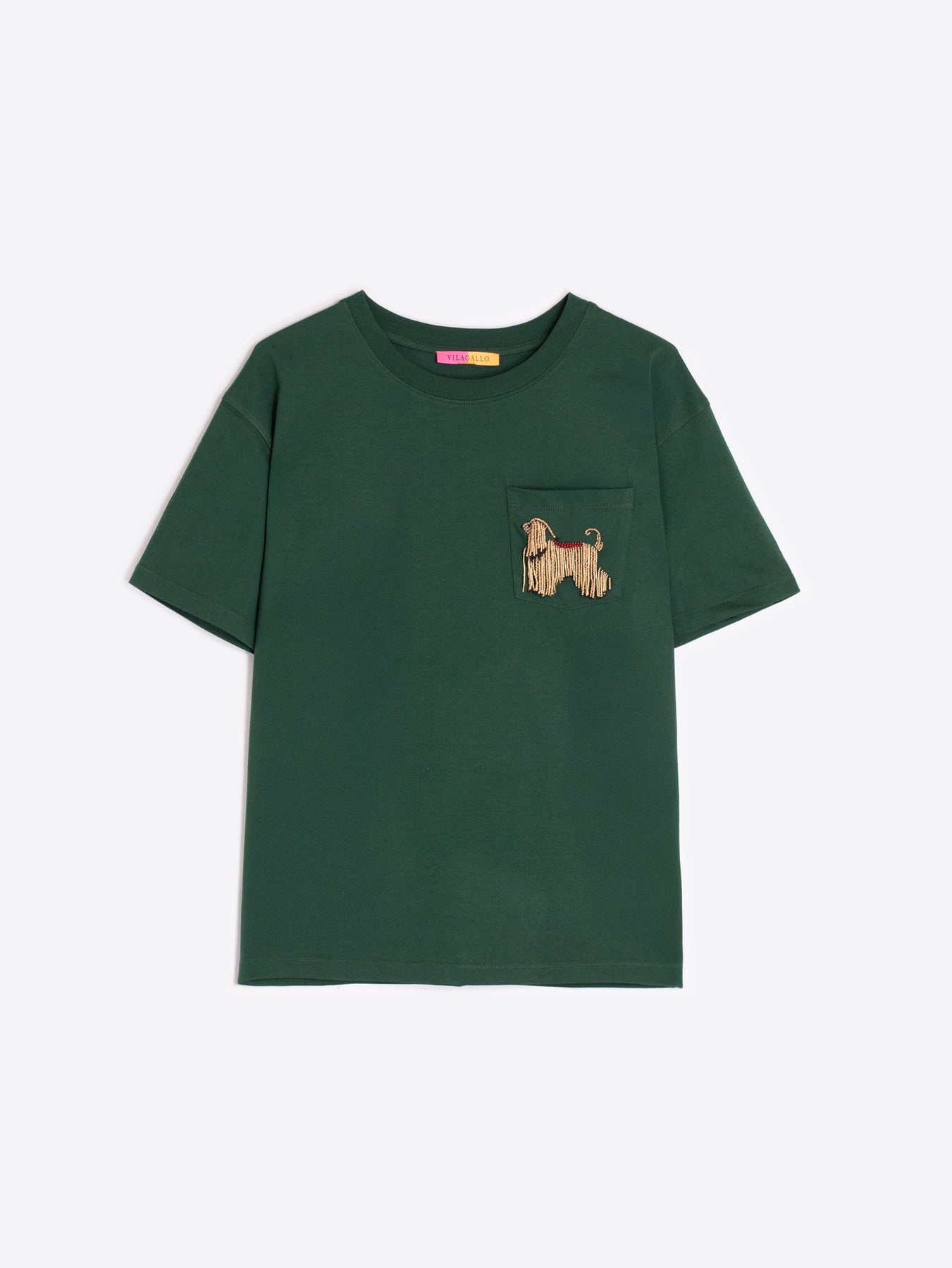 Short-sleeved green T-shirt with a dog silhouette embroidered in gold beadwork on the chest pocket. 100% cotton, round neck and straight cut.