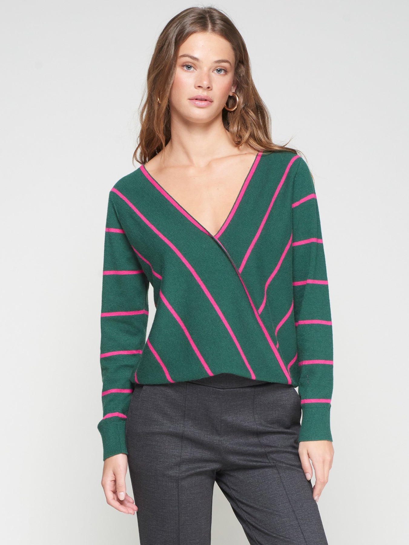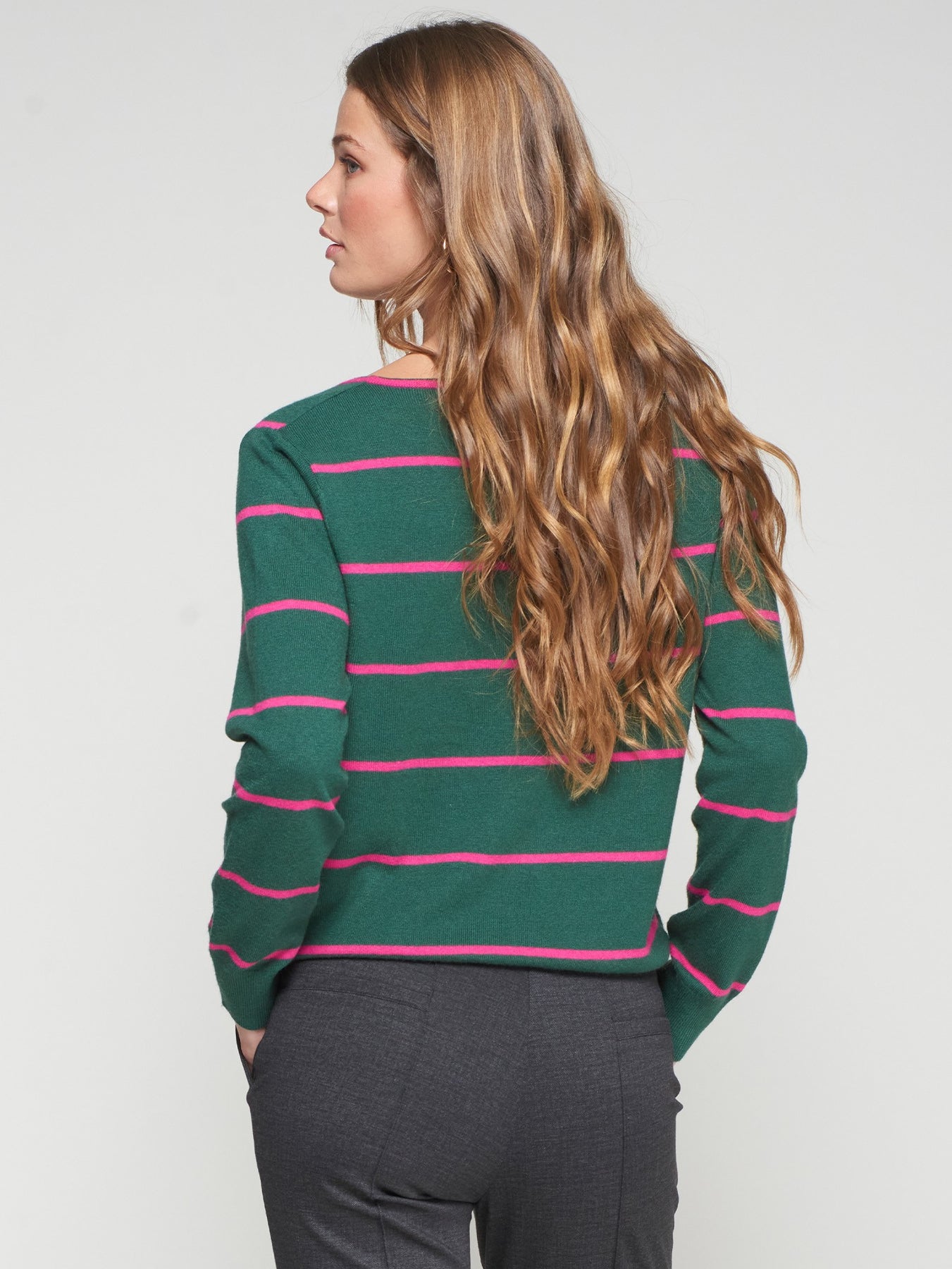Green sweater in soft knit with diagonal and horizontal fuchsia stripes. Crossed V-neckline at the front and long sleeves finished with ribbed cuffs. Straight cut with fitted hem. Light structure and smooth feel. Bold and geometric look.