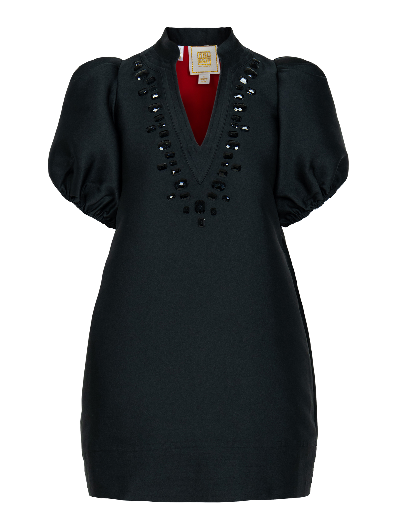 The Hampton Mini in Midnight is a refined yet playful dress featuring puff sleeves, side pockets, and a mandarin-style collar. Its neckline is framed with monochrome stones for a subtle statement, adding just the right touch of party-forward detail. Finished with a bold red lining for an unexpected pop of color, this mini is equal parts elevated and fun.