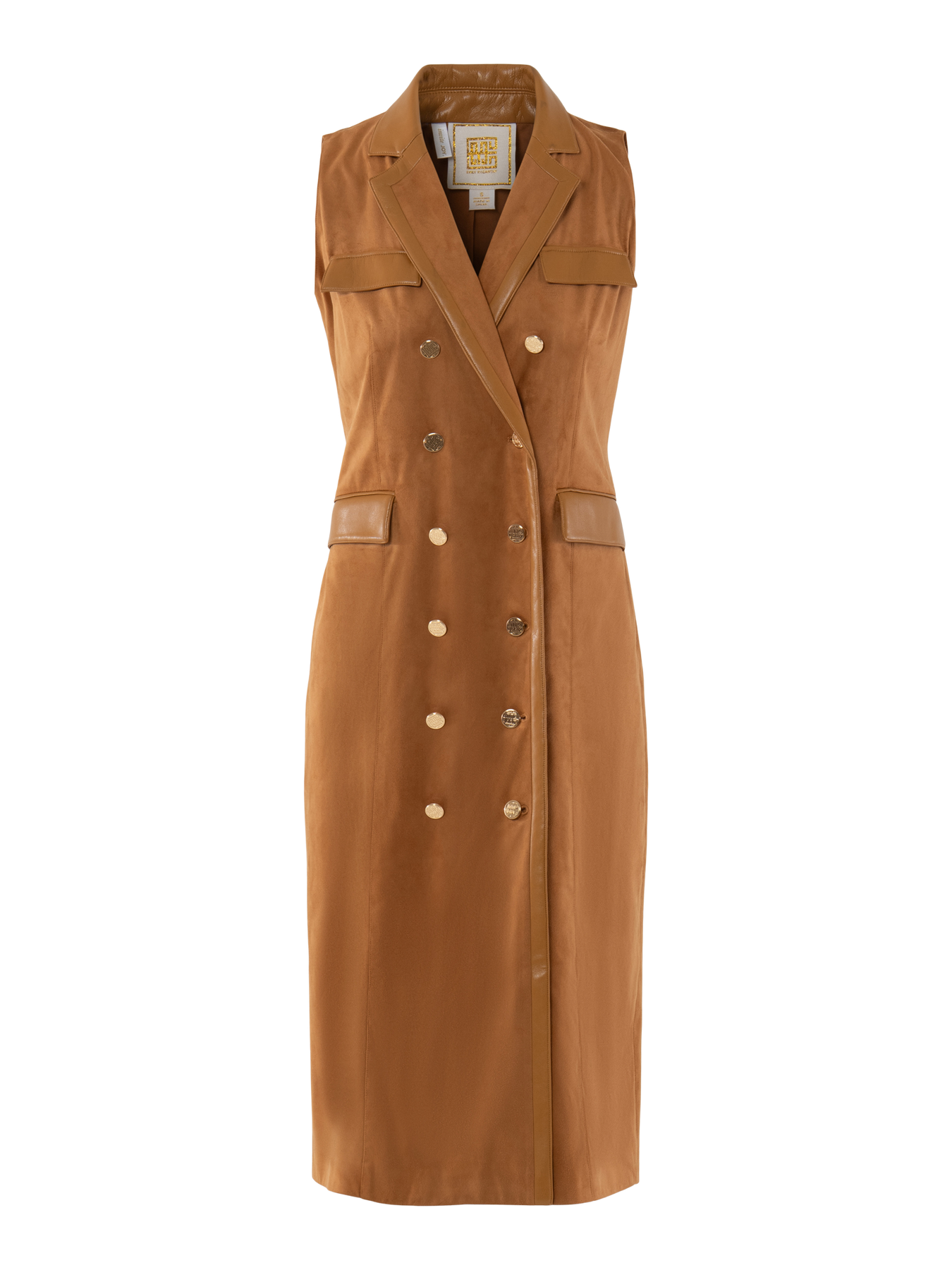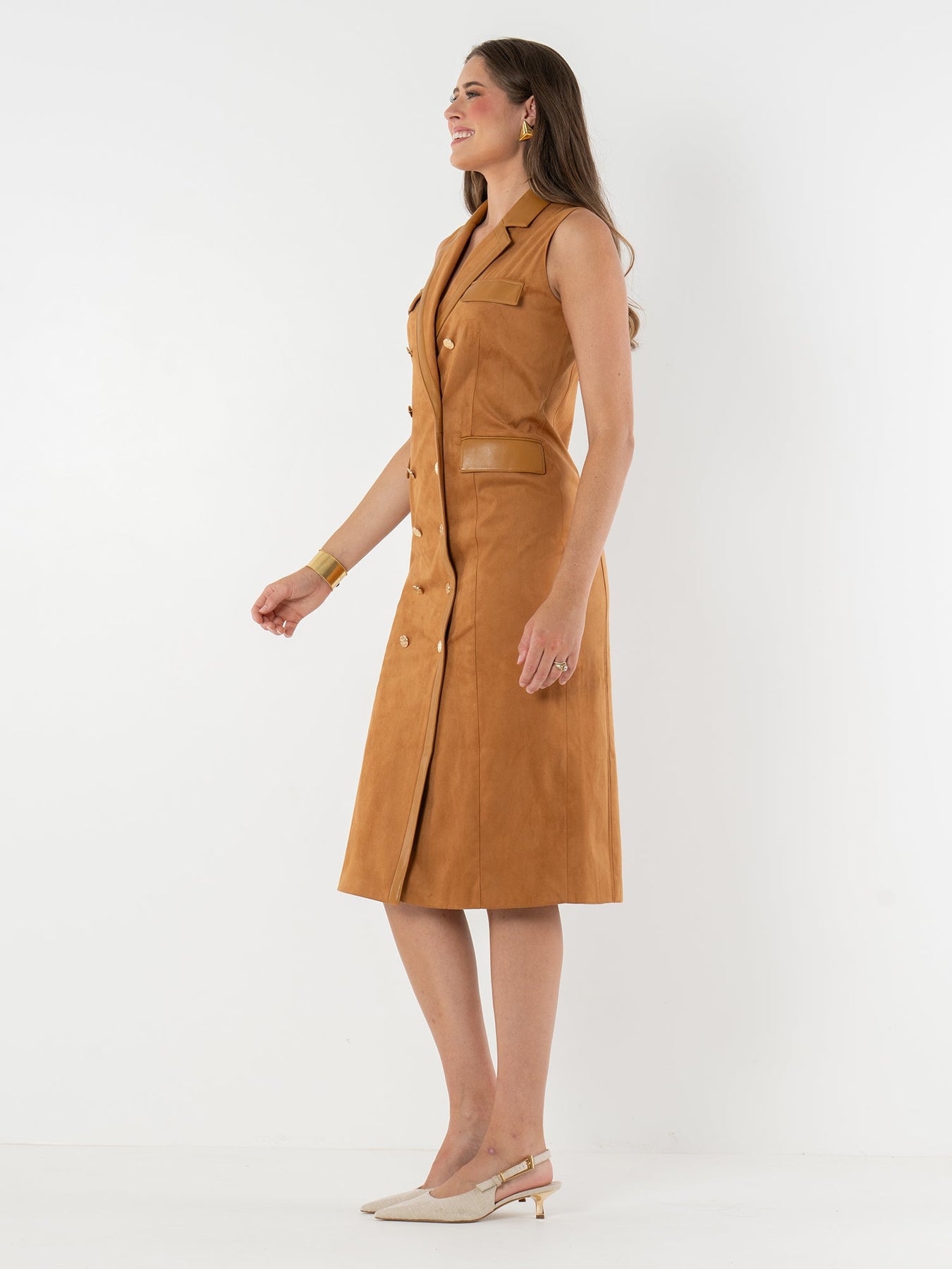 The Kelly Dress in Brown Sugar Suede showcases a sleeveless, double-breasted silhouette with sharp tailoring for a sleek, figure-flattering look. Signature gold hardware buttons add polish, while vegan leather trim highlights the lapel, faux flap pockets, and waist accents. Crafted in a rich suede with luxurious texture, this dress strikes the perfect balance of modern structure and timeless style.