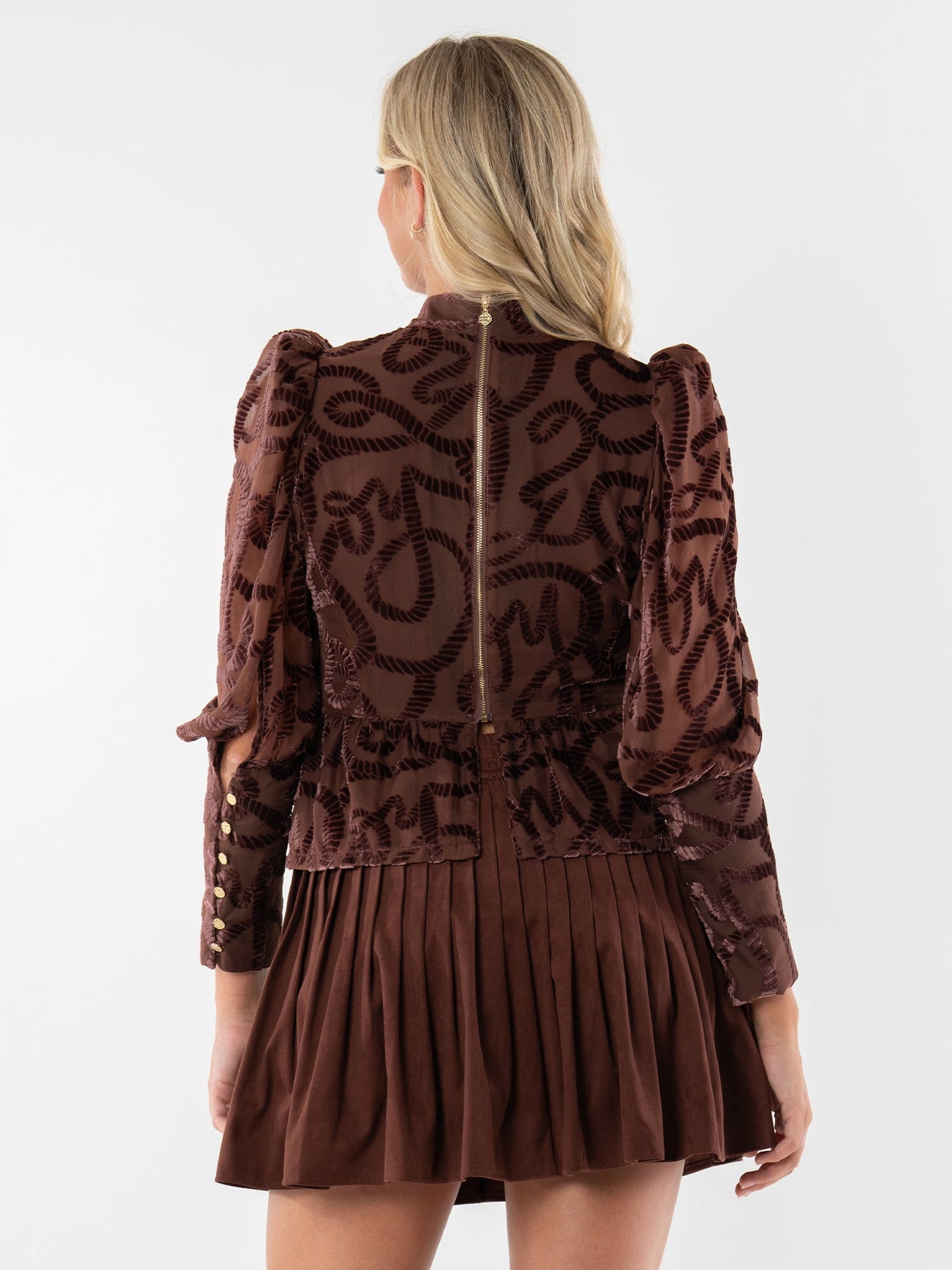 The Zoe Top in Rope is a striking blend of texture and silhouette, designed with voluminous puffed sleeves that taper into a slim fit for a dramatic yet wearable shape. A mock neckline, peplum hem, and back zip closure add polish to the feminine cut. The velvet rope motif spells out “JOY” across the fabric, a subtle nod to western-inspired detail that remains chic, unique, and elevated. Perfect for statement dressing, this top balances playful texture with timeless sophistication.