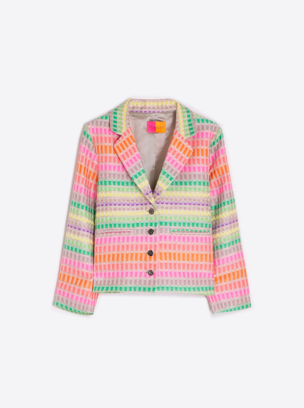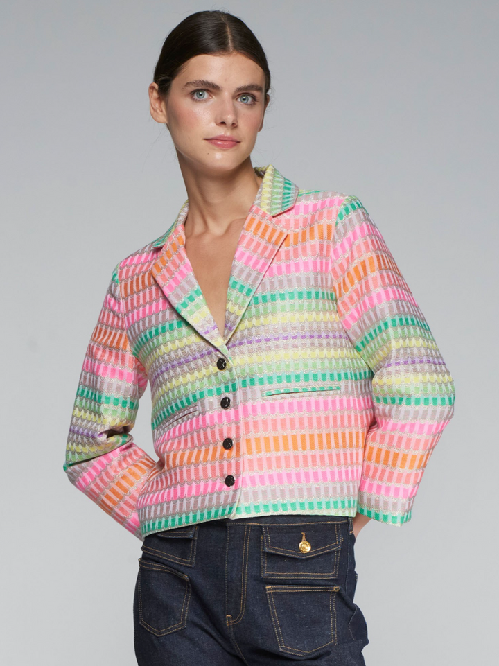 Elevate your wardrobe with the Emma Multicolor Jacket by Vilagallo. This elegant yet fun jacket features a vibrant blend of colors that effortlessly brighten any outfit. Perfect for adding a playful touch to your sophisticated style, it combines comfort and chic design for versatile wear. Make a bold statement with this unique piece that brings energy and elegance to your everyday look.
