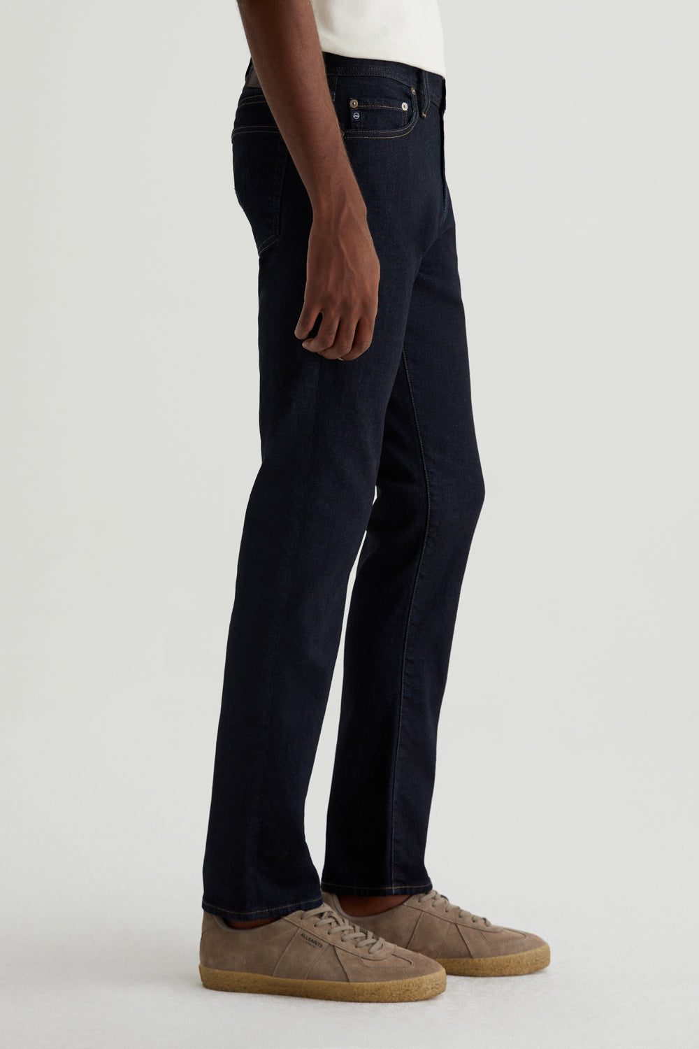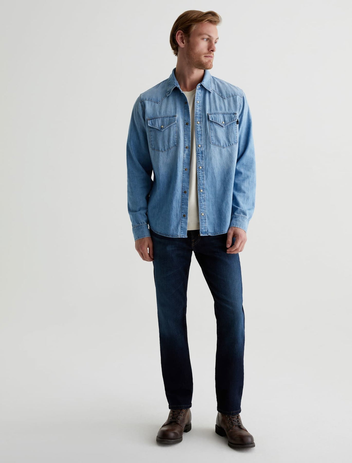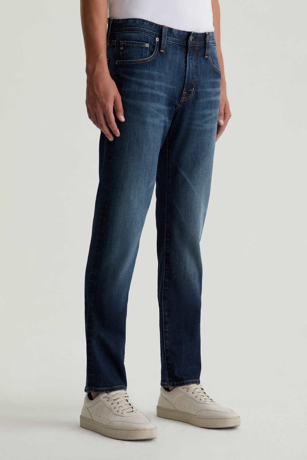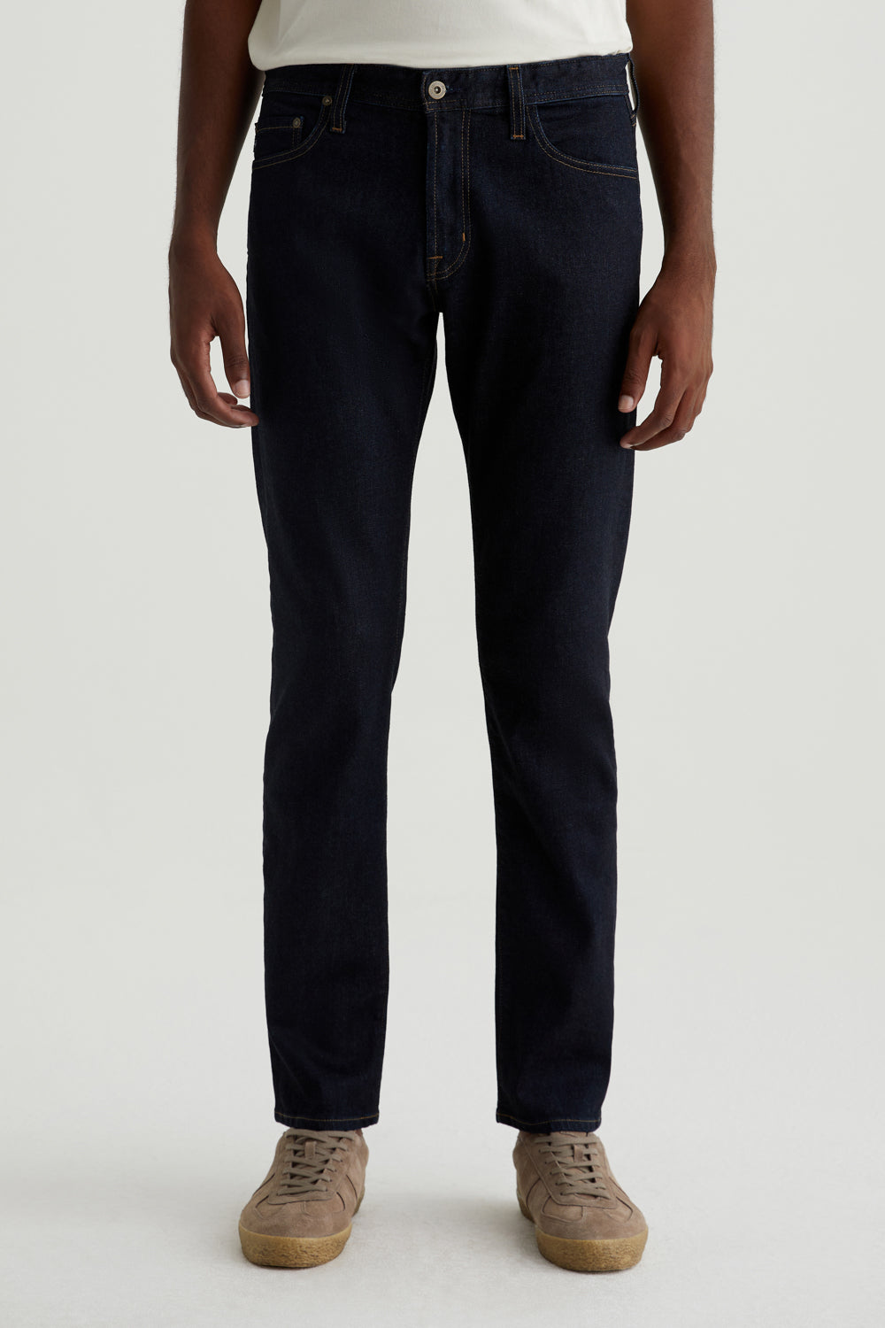 Everett is a slim straight jean for men, featured here in a dark blue wash with fading and whiskering. The style has a comfortable mid-rise waist and a straight fit that’s relaxed from hip to the knee before slightly tapering at the leg opening. These men's slim straight jeans are designed in 11.2 oz. Union Dark Denim with comfort stretch. Contrast stitching finishes the five-pocket construction