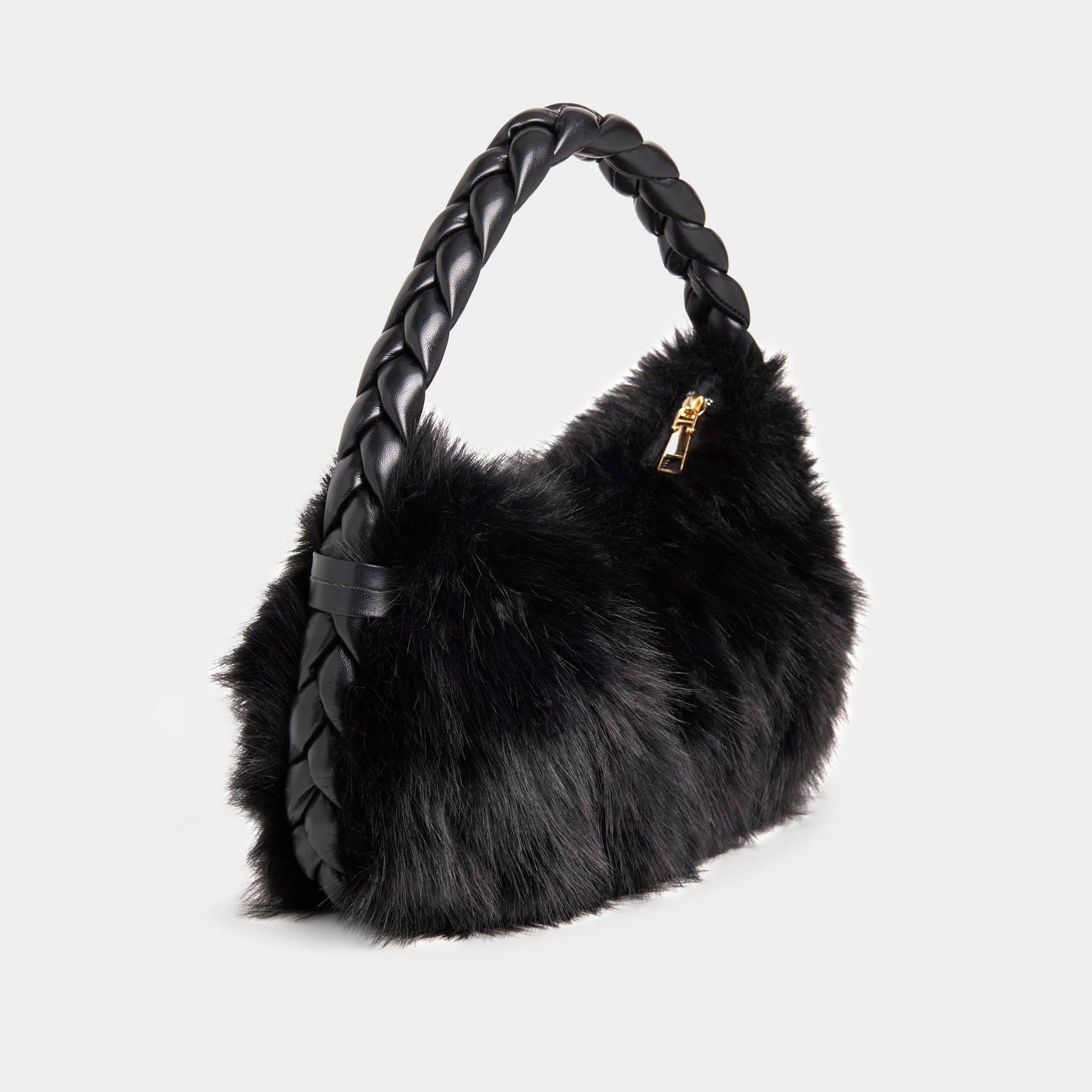 Gorgeous fashion tote covered in plush faux fur, oversized braided vegan leather handle, zip closure reveals a satin lined interior. Perfect for day or night. Dimensions: 12"W x 6"H x 3"D.