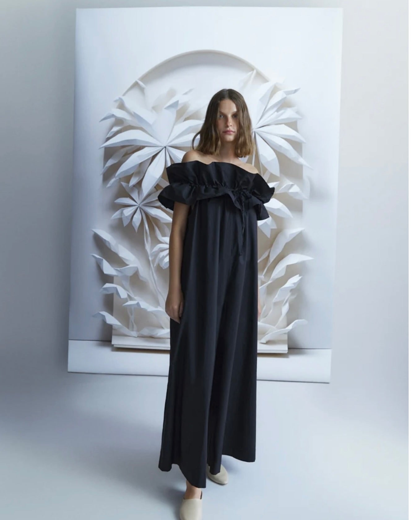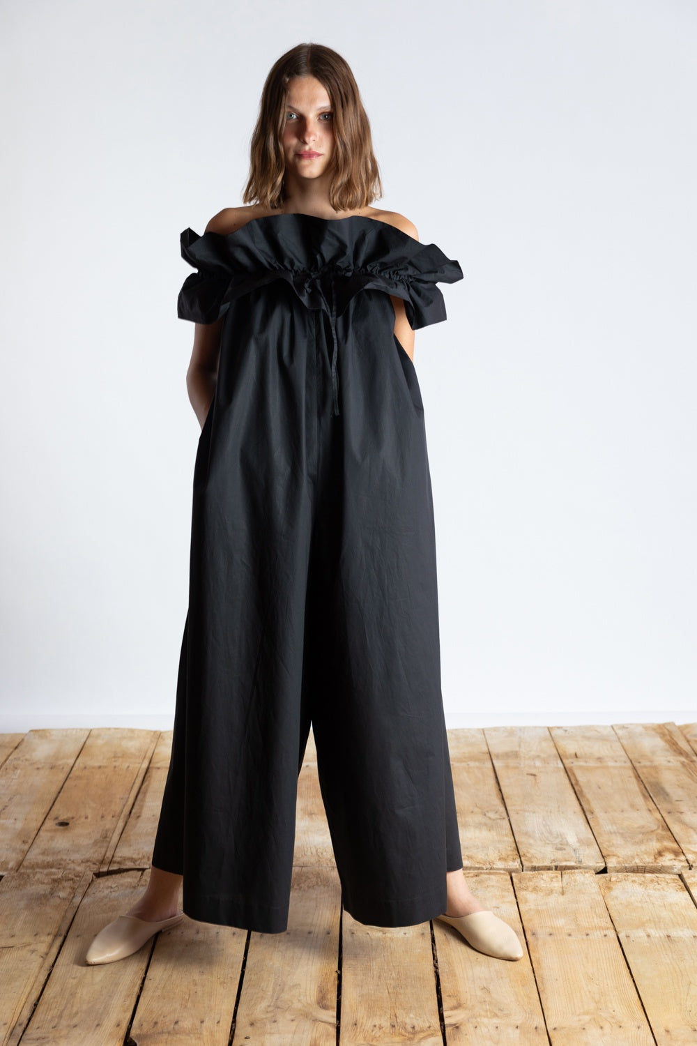 A bold and elegant jumpsuit with a ruffled neckline, tie straps, and a relaxed, wide-leg silhouette.