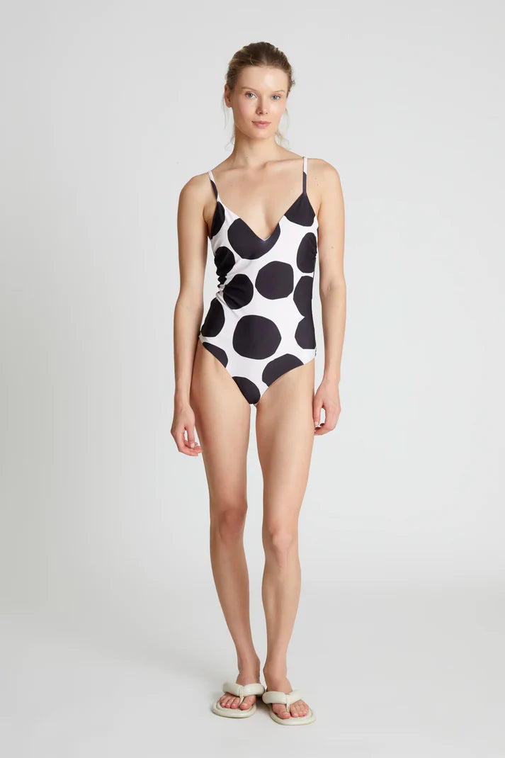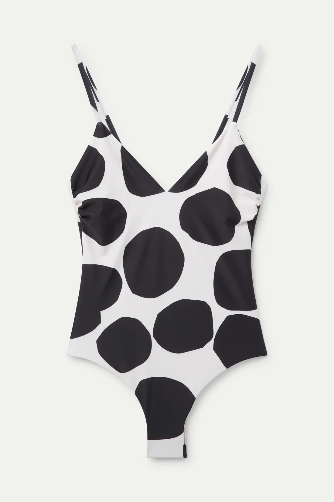 This one-piece swimsuit features a striking terrazzo-inspired geometric print that adds a modern edge to your beachwear. Designed with a flattering V-neck and adjustable straps, it ensures a comfortable, customized fit. The low back detail enhances its sleek silhouette, making it perfect for stylish swims and sunbathing alike. Elevate your swim collection with this chic and versatile piece.