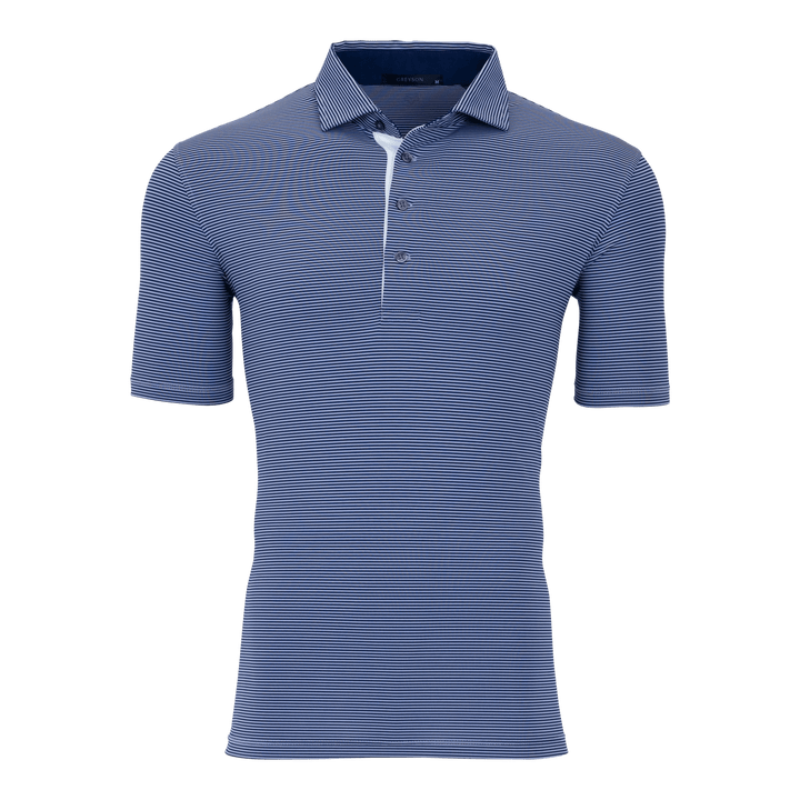 A classic stripe that transitions effortlessly from the golf course to every part of your lifestyle. Constructed with a blend of polyester and spandex fabric, the Saranac is finished with a sateen wash creating a silky hand. This mini feed striped polo features a four button placket with a pop of color on the neck and placket.