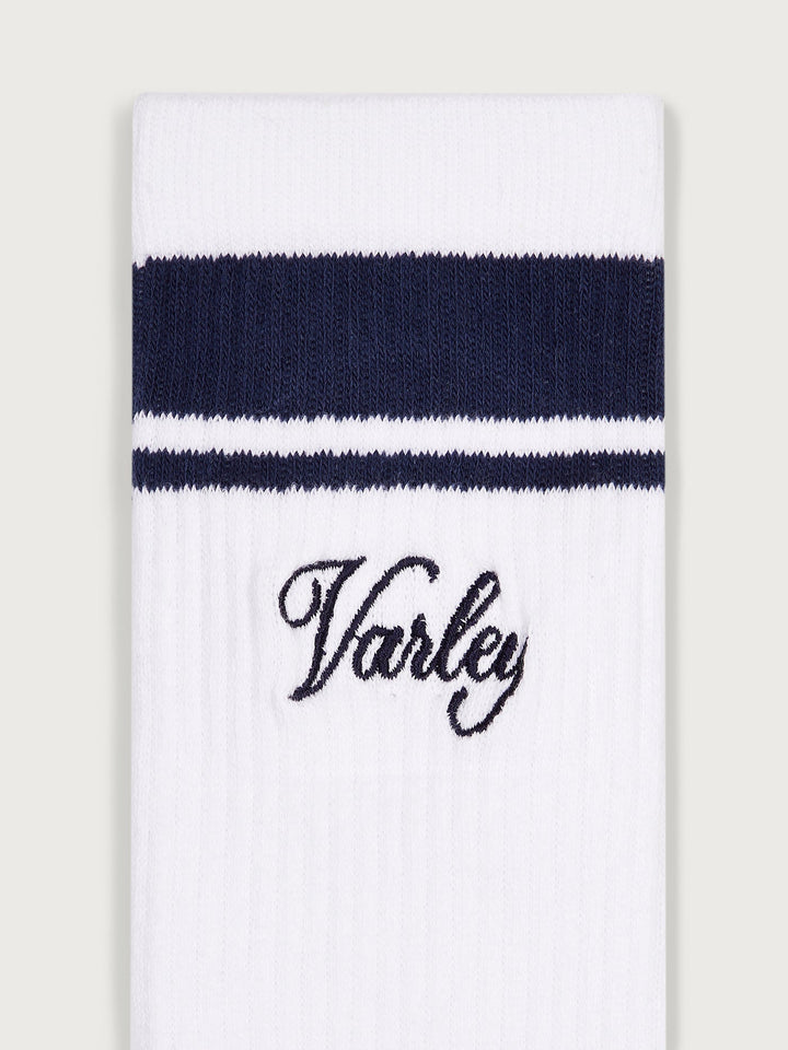 With their ribbed aesthetic and cotton-blend construction, the Lamar club socks are perfect for everyday wear. They are finished with stripe detailing and Varley namesake to the side and sole of the foot.
