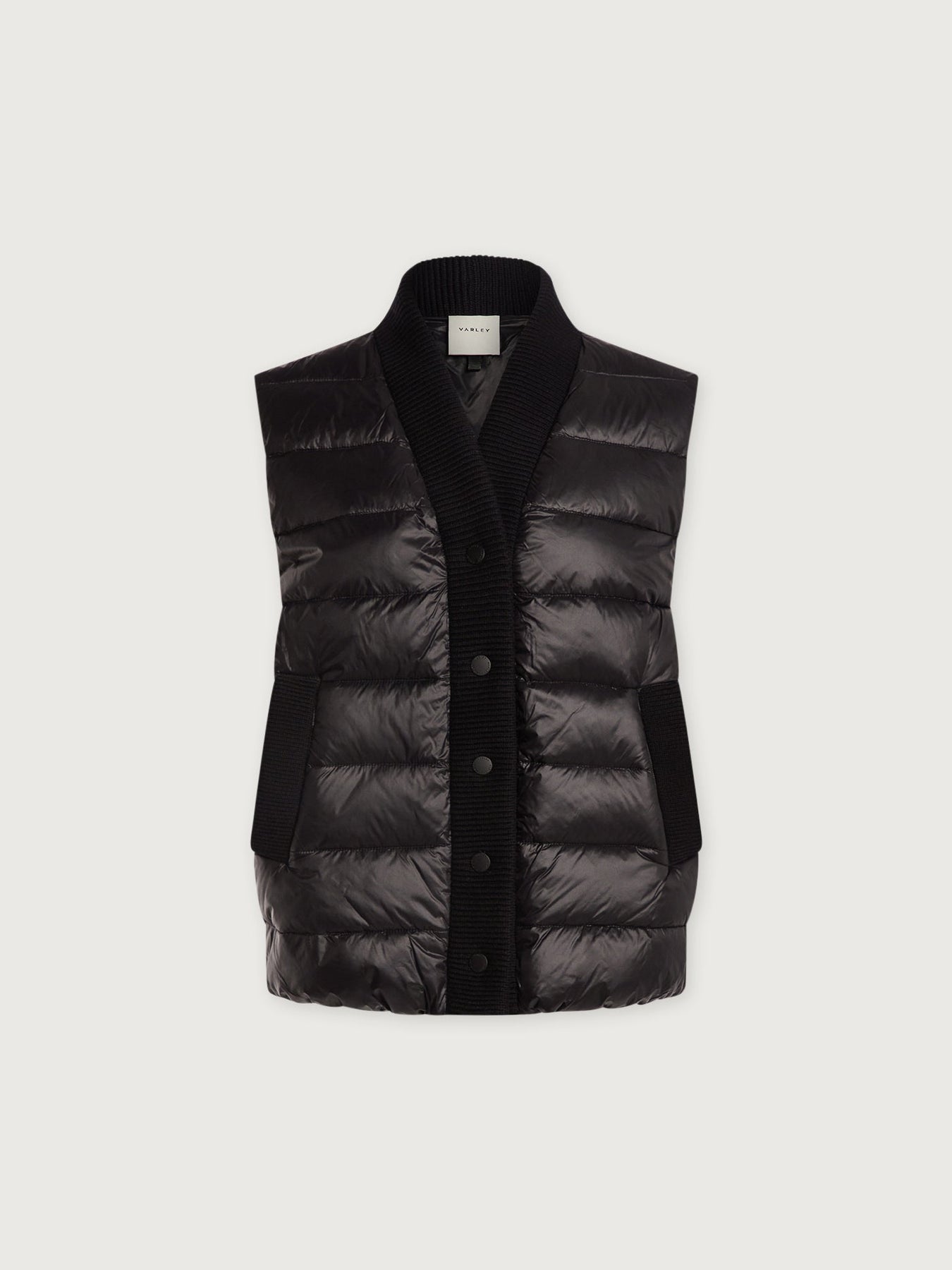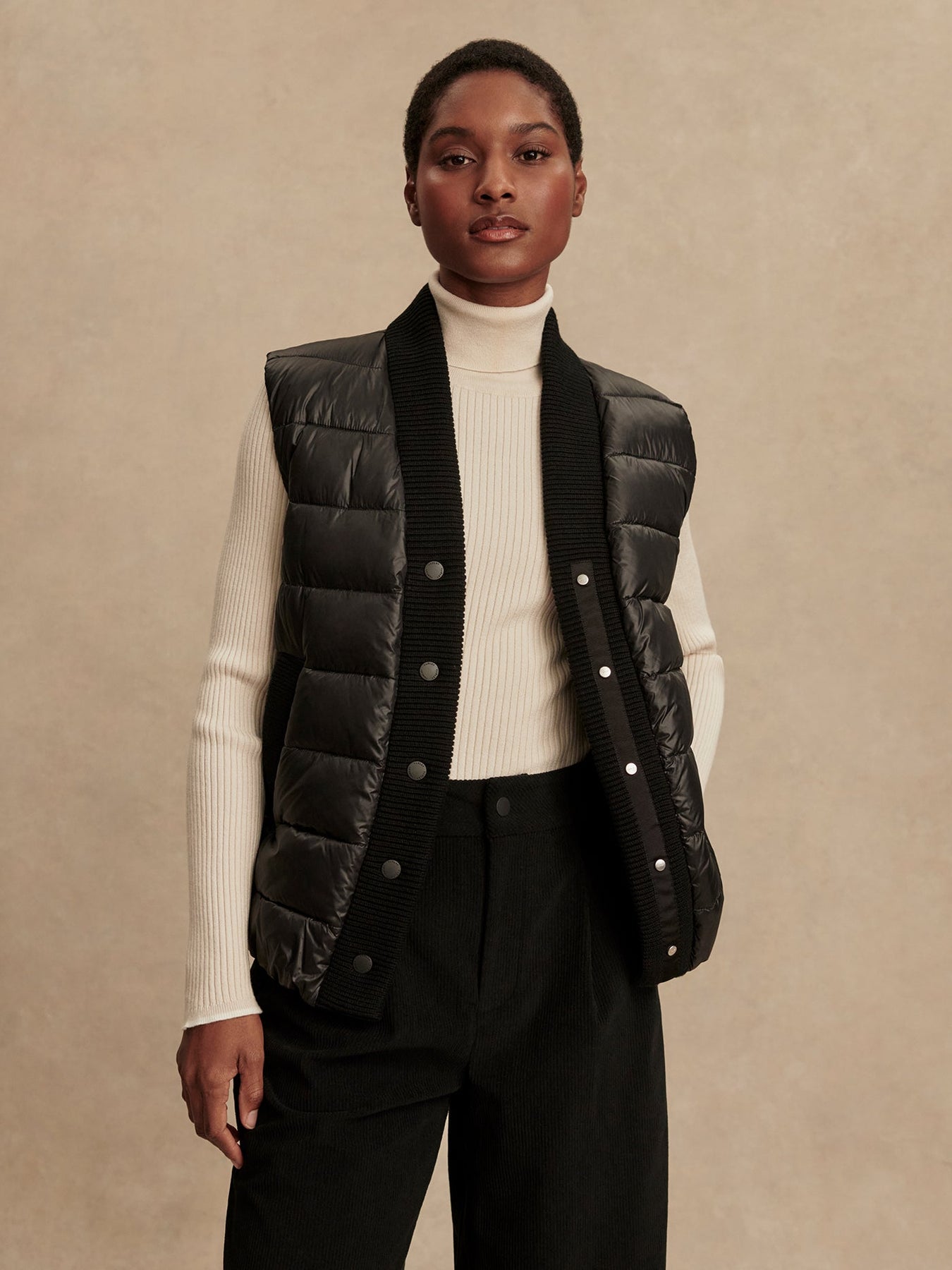 Featuring a relaxed fit and lightweight, quilted nylon for insulation, this gilet combines practicality with modern design. The knitted placket and trims add a unique touch, while the snap fastening makes it perfect for easy layering.